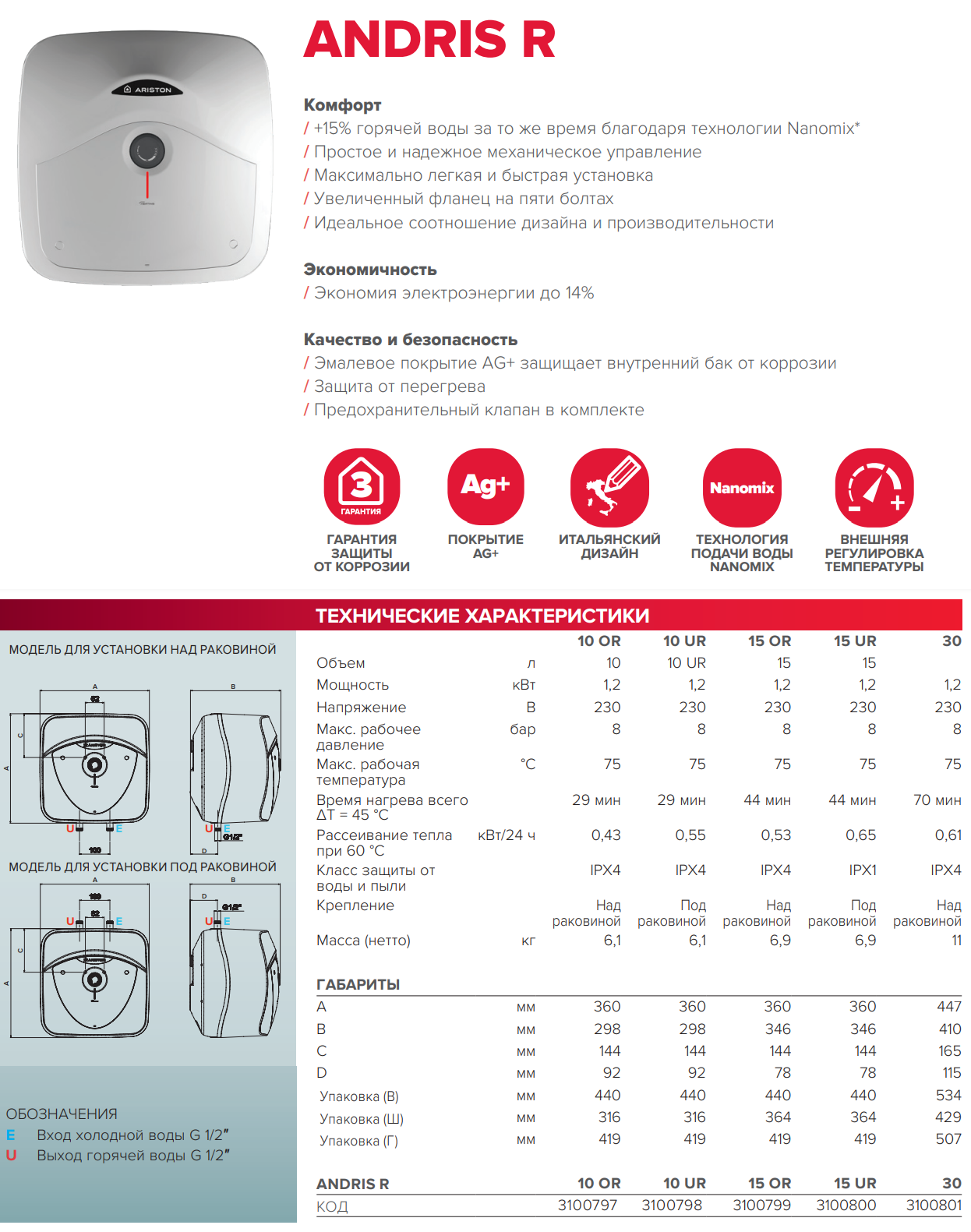Бренд Ariston Модель Andris R 10U Тип Накопительный Форм-фактор Квадратный Объем бака,л 10 Способ нагрева электрический Мощность кВт 1.2 Внутреннее покрытие эмаль Управление Механическое Подводка труб Верхняя Расположение под раковиной Способ крепления настенный Особенности Защита от перегрева, Механический термостат Напряжение 220 В Гарантия(месяцев) 60 Высота см. 36 Ширина см. 36 Глубина см. 29.8 Ускоренный нагрев (Быстрый нагрев) Да -