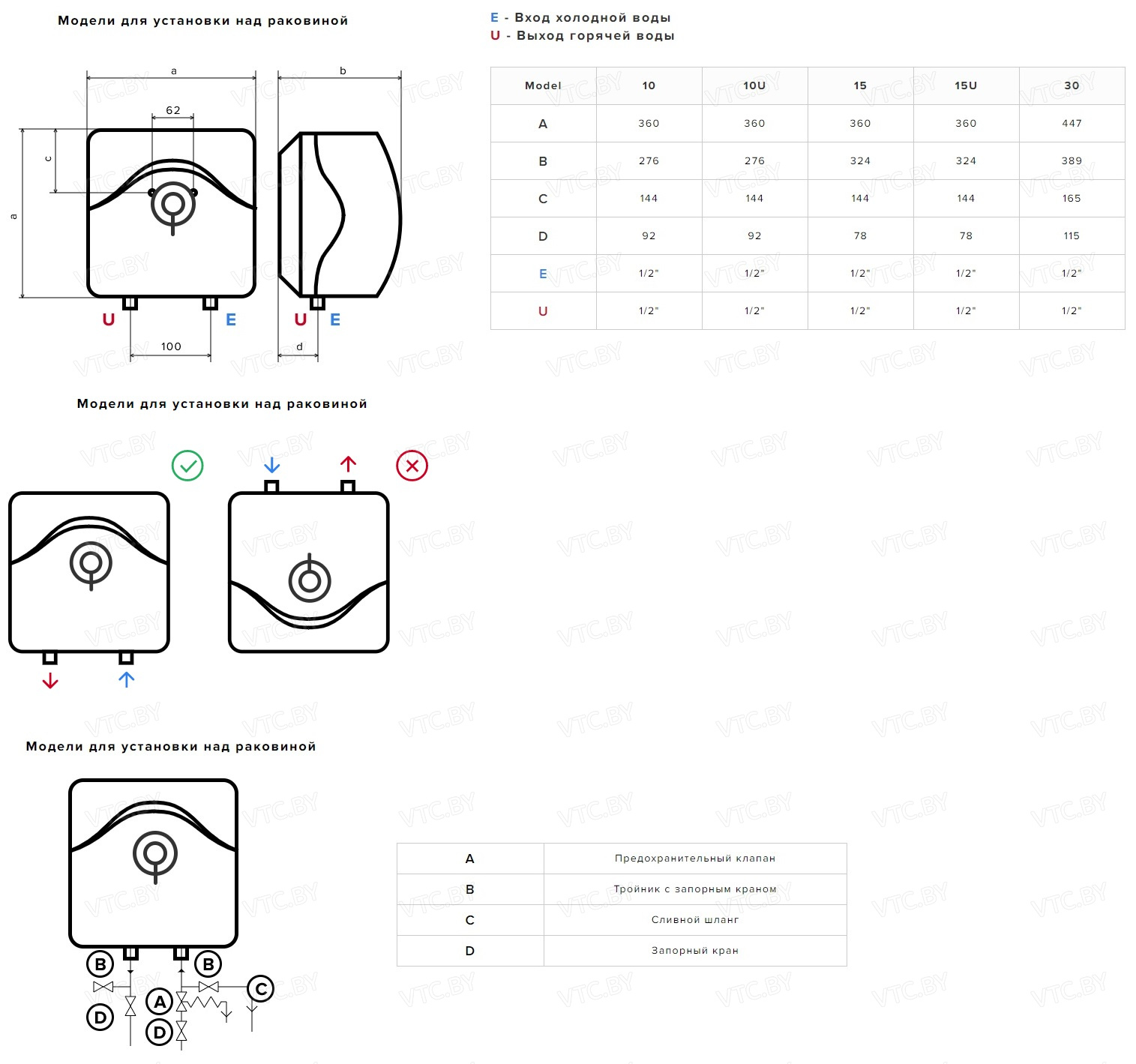 - Установка над раковиной: Открытый монтаж, обеспечивающий легкий доступ для обслуживания и экономию места под мойкой.