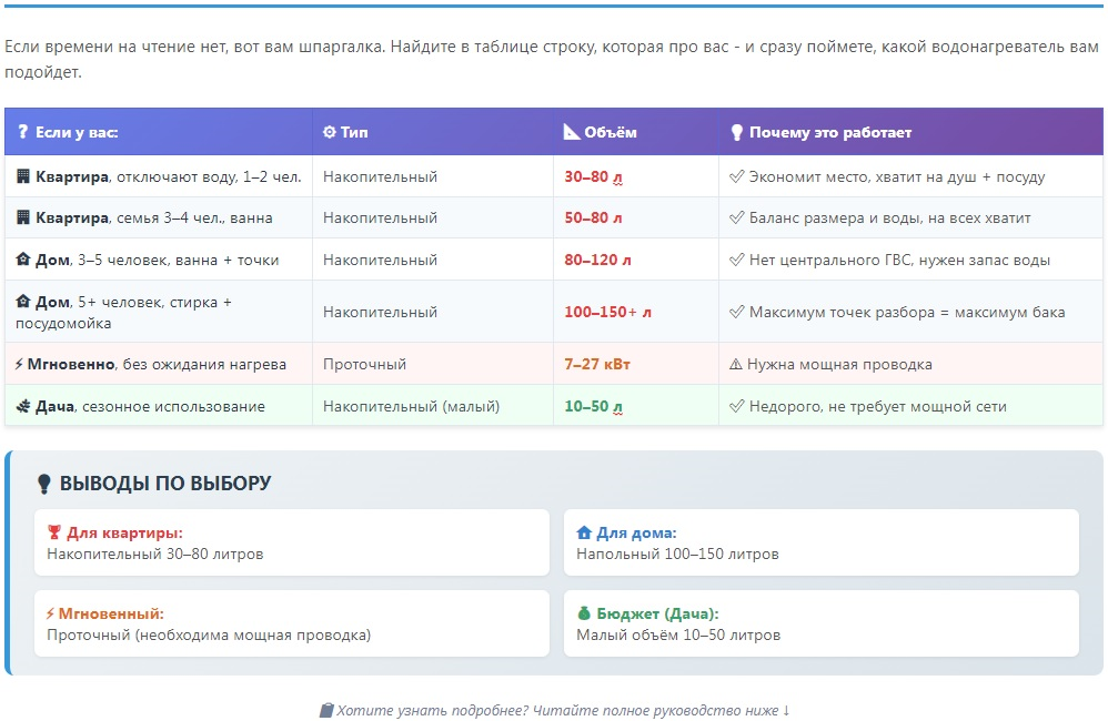 Главное - выбирайте водонагреватель под свои реальные привычки, а не под идеальные расчеты. Если вы живёте один и моетесь быстро — не переплачивайте за объемный бак. Но если у вас большая семья и жёсткая вода — не экономьте на покрытии и аноде. Правильный выбор — это баланс между потребностями, бюджетом и безопасностью.