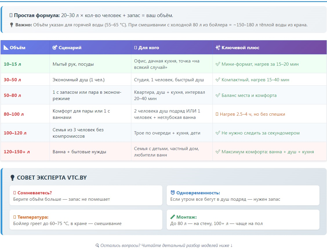 Совет от экспертов VTC.BY: При расчёте объёма учитывайте не только количество людей, но и одновременное использование (душ + кухня). И помните: бойлер греет воду до 60–75 °C, а в кране вы смешиваете её с холодной. Поэтому 80 литров горячей воды это примерно 150–180 литров тёплой из крана.