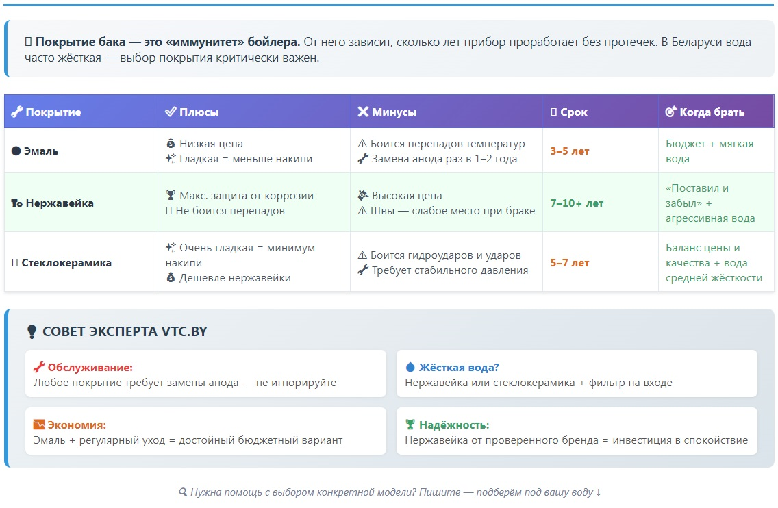 Совет эксперта VTC.BY: Независимо от типа покрытия, обязательно следите за магниевым анодом — он защищает бак от коррозии. Даже эмалевый бак прослужит в 1.5–2 раза дольше если менять его раз в 1–2 года. Если не знаете, какая вода у вас — берите нержавейку или стеклокерамику: они лучше переносят белорусские реалии.