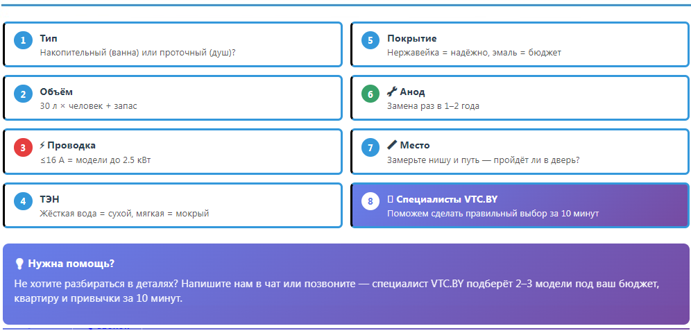 Чтобы вы не запутались в характеристиках, эксперты VTC.BY собрали три простых правила:1. Не берите слишком мощный водонагреватель, если проводка не позволяет. Для 90% квартир в старом фонде безопасный предел — 2–2.5 кВт. Лучше греть воду на 30 минут дольше, чем менять кабель во всей квартире или рисковать коротким замыканием.